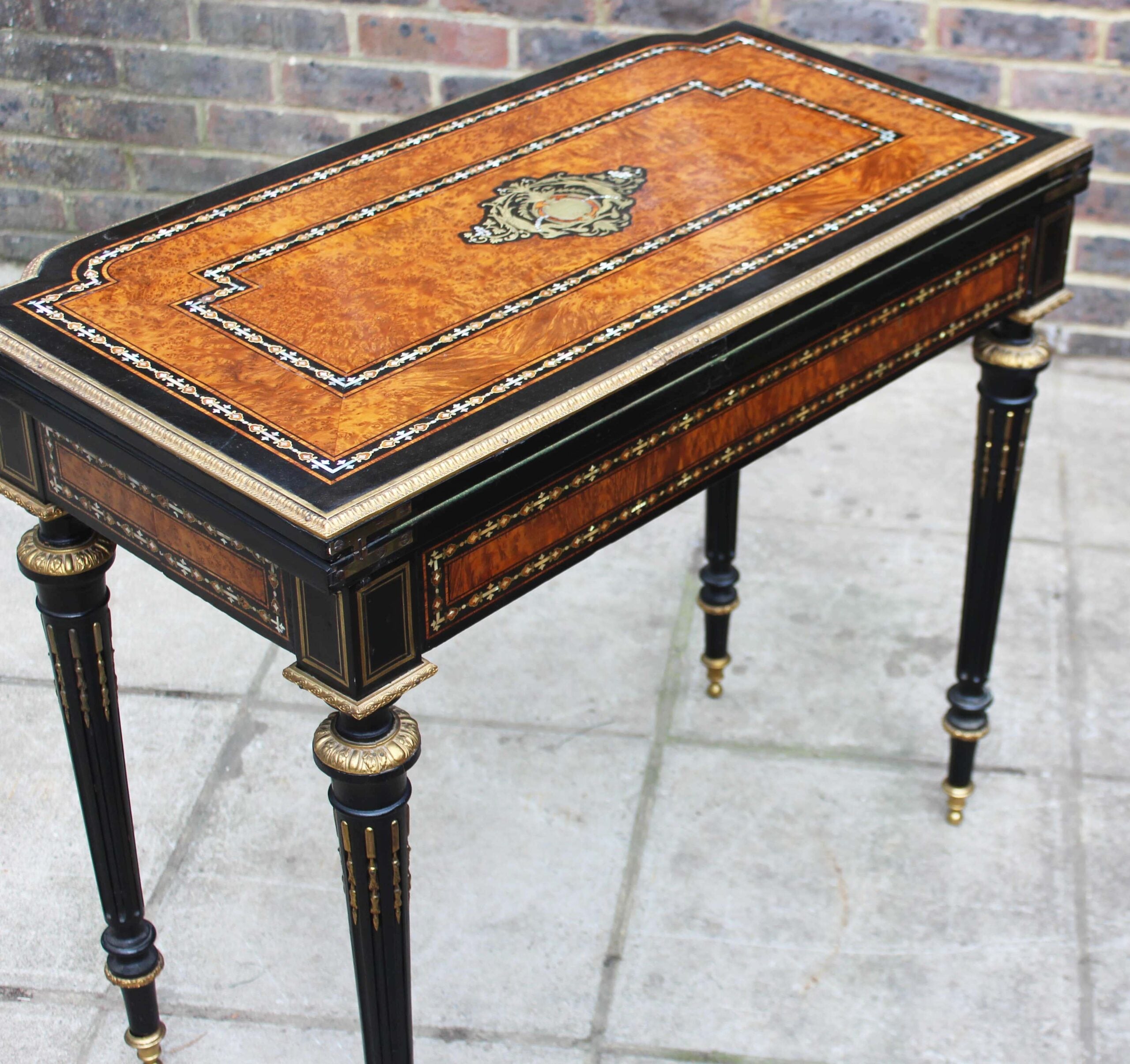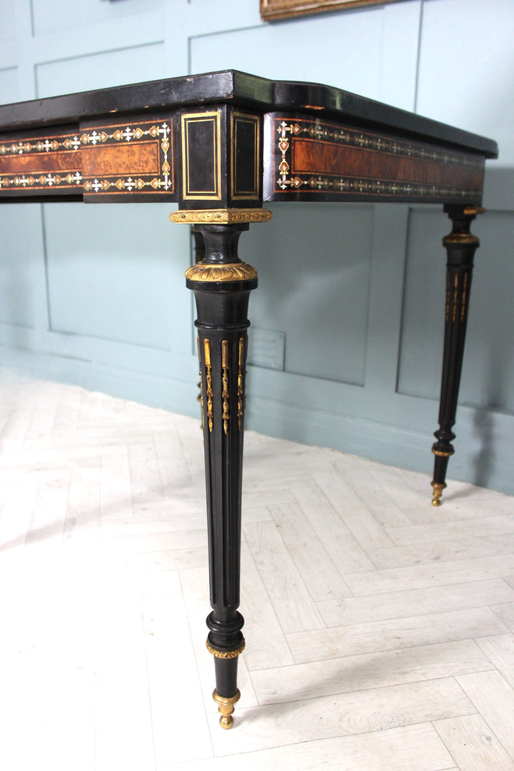 The Antique French Napoleon III Inlaid Card Table is in good antique condition. Although the ebonized top has a few light scratches, these imperfections are minor and consistent with its age. More importantly, they do not detract from its overall charm or value. Consequently, the table remains a remarkable addition to any collection or sophisticated space.