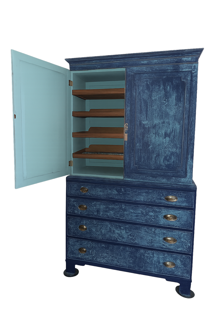 Excellent condition, refurbished and Artistically refinished by hand, the exterior has been rag-rolled in layered tones of Annie Sloan Old White, Freda Blue, and Provence Turquoise, creating depth, texture, and a beautifully aged patina reminiscent of French country antiques. The interior is painted in a vibrant turquoise, adding an unexpected pop of colour and charm.