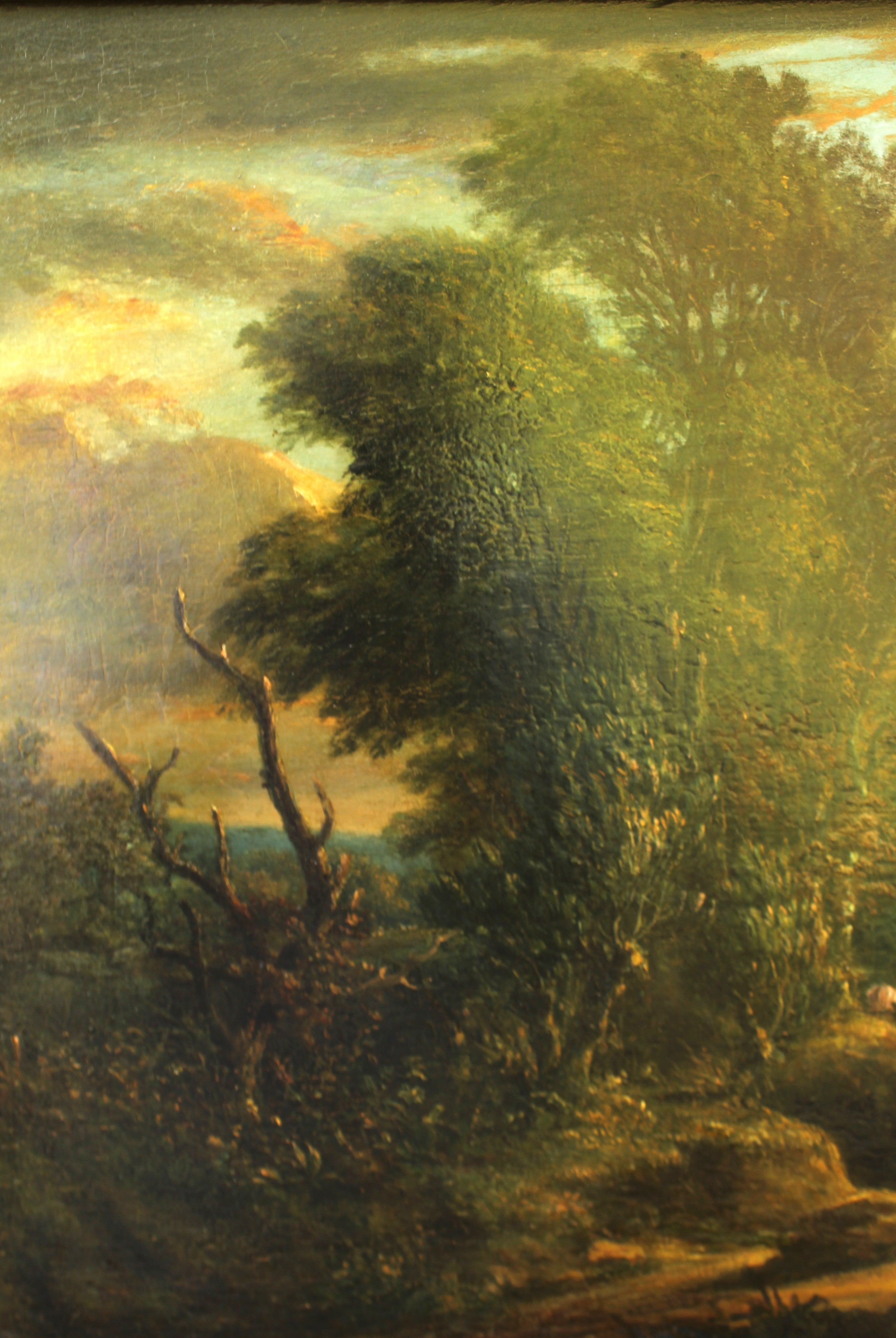 A figure by the pond appears to be a later 19th-century addition. This type of enhancement was a common practice at the time, introduced to enrich the narrative and picturesque quality of landscape paintings. The addition has aged naturally with the work and forms part of its history.