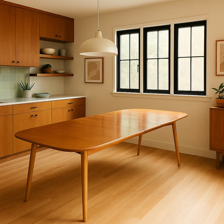 The fifth central leg was praised by the original owner for "never wobbling, even with the turkey and trifle on top," and the extension leaf was used for every family celebration. Over time, the elm top developed a subtle warmth, aged naturally by sunlight and care, while the solid beech legs remained sturdy and true.