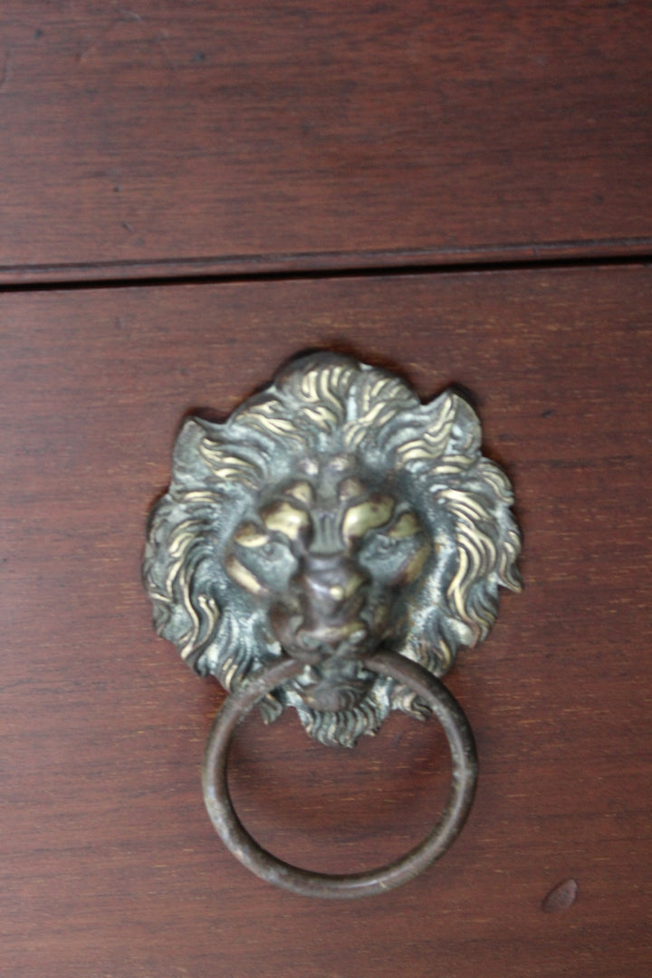 What drew us in first wasn’t the size — though it’s generous — or even the striking sarcophagus shape, with its sculptural depth and Regency drama. It was the surface. That rich, waxed mahogany glow that only 200+ years of polishing, parties, and quiet evenings can produce. Still lined in its original tin. Still standing proud on tapered legs with brass casters. And still flanked by lion mask handles, regal and ready.