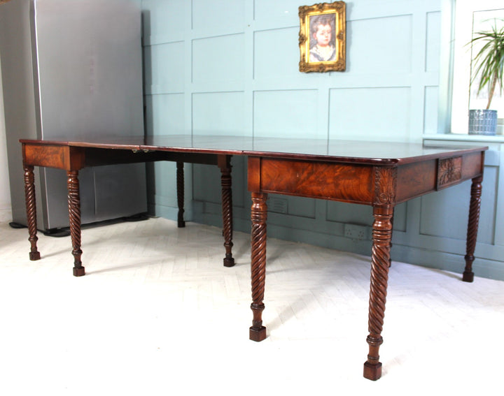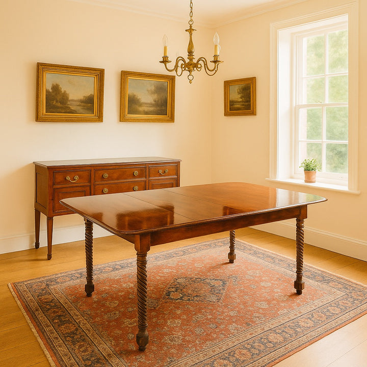 This stately Federal-period dining table was acquired from a Georgian country house near Bath, where it had served as a central piece in the formal dining room since the mid-19th century. Family records and architectural context suggest the table was originally brought over from Massachusetts sometime between 1830 and 1850, likely by a prosperous British merchant with American ties following the War of 1812.