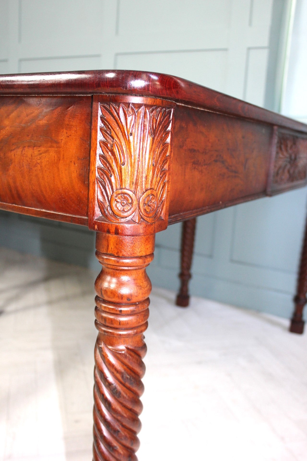 In the Federal Period, this Massachusetts Cuban Mahogany dining table with a specimen ‘cathedral grained’ top features hand-carved foliate-trimmed end and corner plaques. Notably, this versatile table can seat up to 12 people for large gatherings. Alternatively, it can function as a smaller table for 4-6 people, or even as two separate console tables, offering multiple uses.