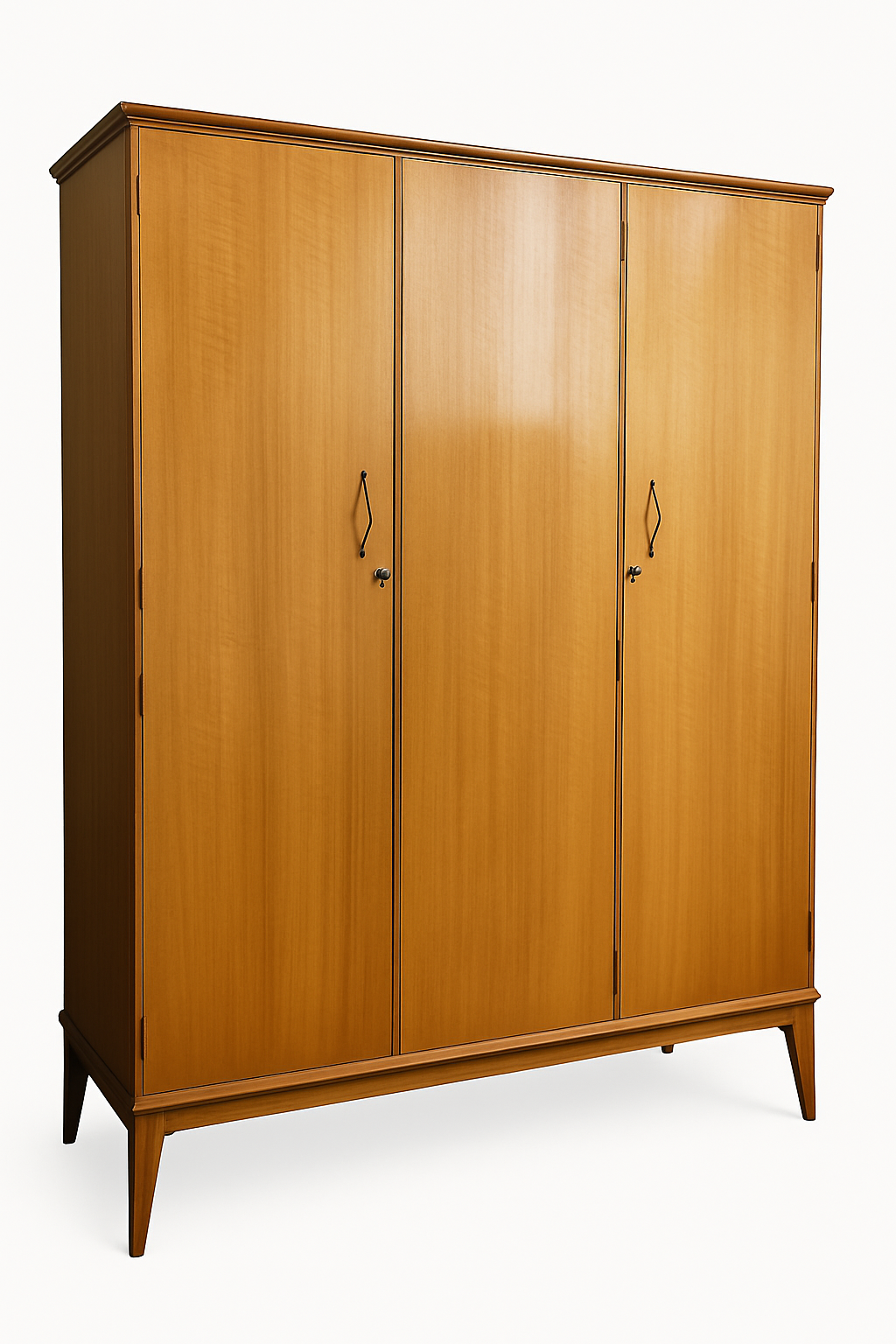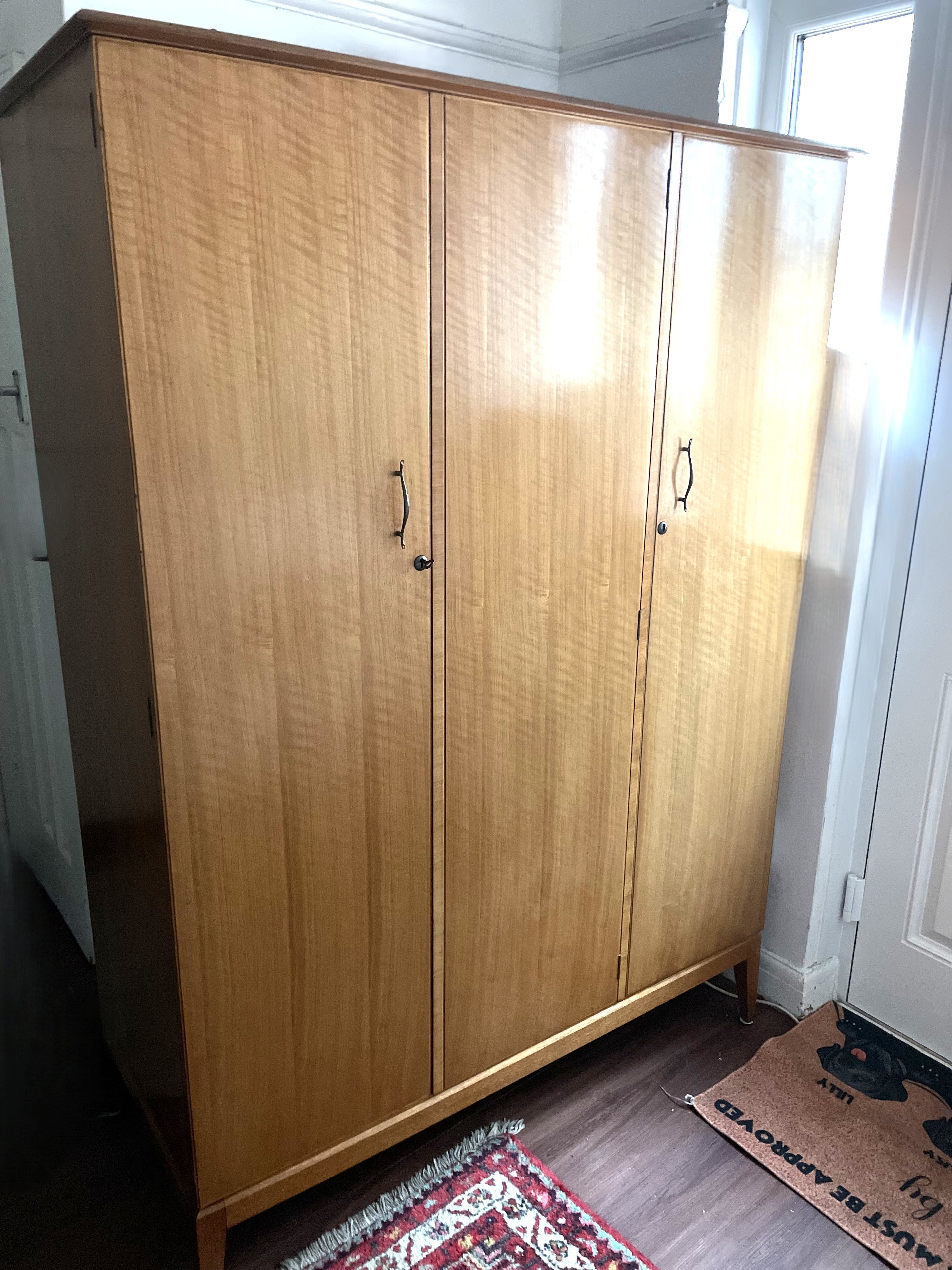 A beautifully crafted mid-century walnut wardrobe designed by Alfred Cox, dating to the 1960s and originally retailed through the esteemed Heal's department store. This triple-door wardrobe exemplifies the clean, elegant lines and practical functionality that defined British mid-century modern design.