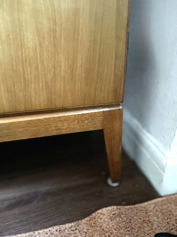 With slender tapered legs and minimalist handles, this is a timeless storage piece that blends seamlessly into both retro and contemporary settings.