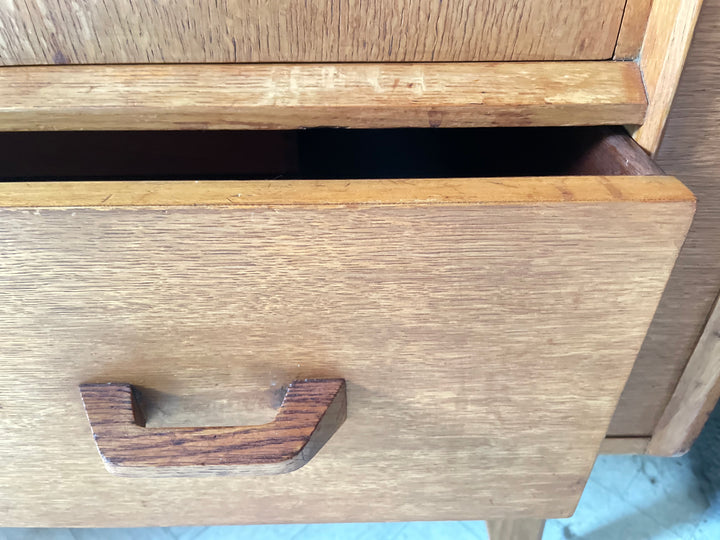 While Brandon sideboards are most commonly found in light oak veneer, this example stands out for its excellent condition and for retaining two particularly sought-after original features rarely found together: