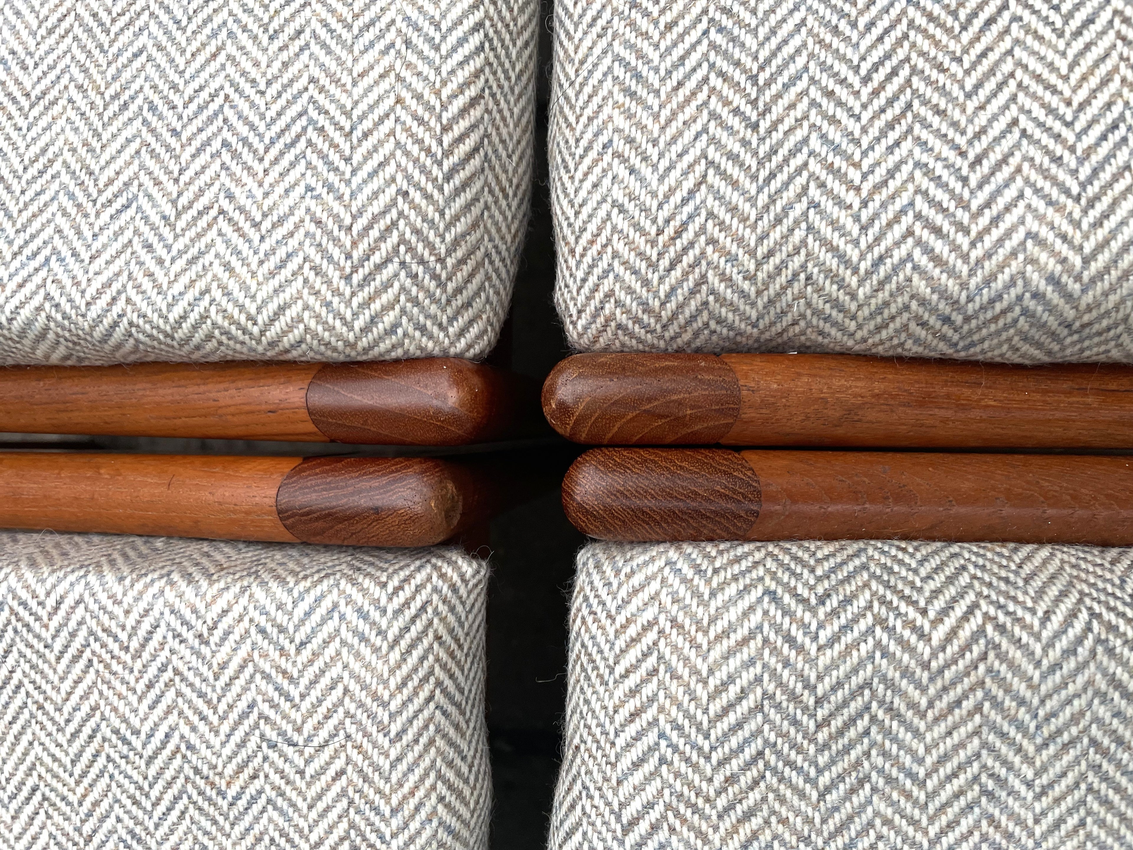 The chairs are in the process of being upholstered, with new foam, wadding and fabric to comply with current fire and safety regulations 2025. The fabric - Luxury Yorkshire Herringbone Tweed - Winter Coast and is in a similar colour to what was on the original chairs. Please view the extra images, as I have included some images of the new fabric.