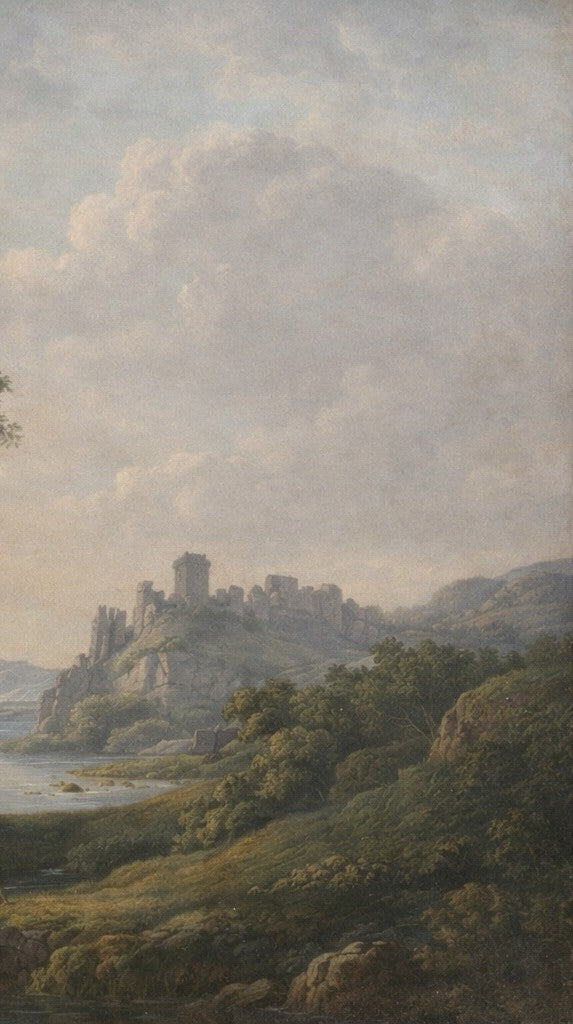 The artist builds the composition around a central group of mature trees. Their softly modulated foliage anchors the scene and frames the wider landscape. In the distance, castellated ruins and classical structures evoke an idealised vision of antiquity. Small staffage figures appear in the foreground and middle ground. They provide scale and narrative interest without distracting from the overall harmony.