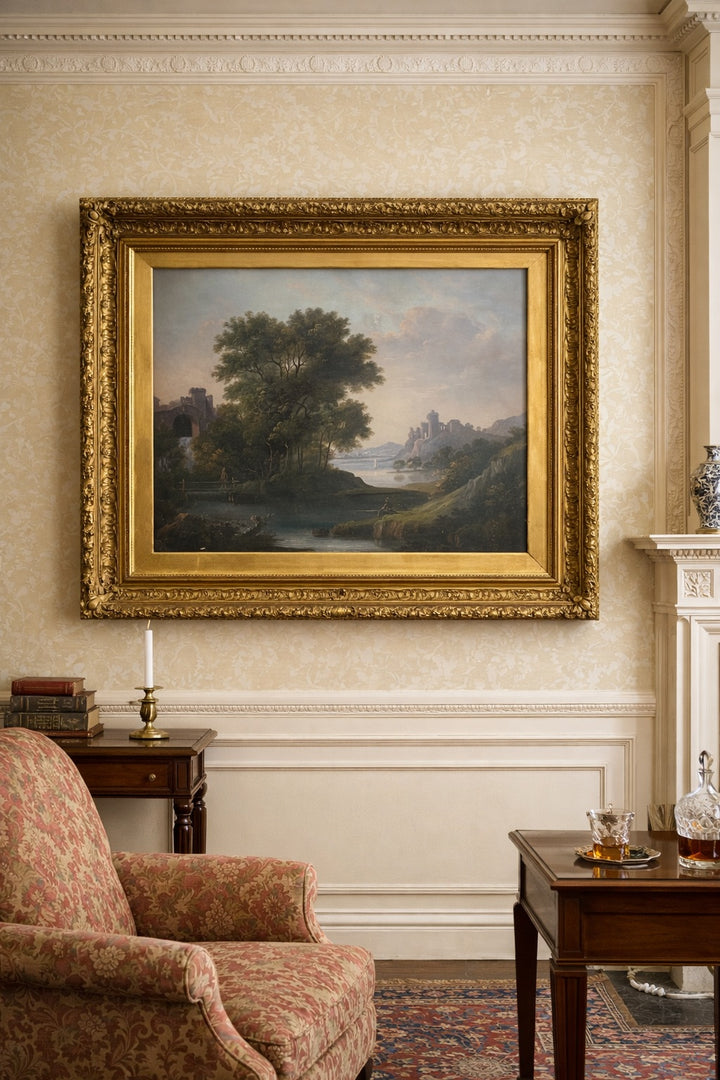 This Scottish School Italianate landscape is a refined example of late 18th-century British landscape painting. Scottish artists of this period absorbed strong influences from the Roman Campagna and the classical ideals of the Grand Tour. Executed in oil on canvas, the painting presents a calm pastoral scene with classical ruins, gently rolling terrain, and a river or estuary that leads the eye into the distance.