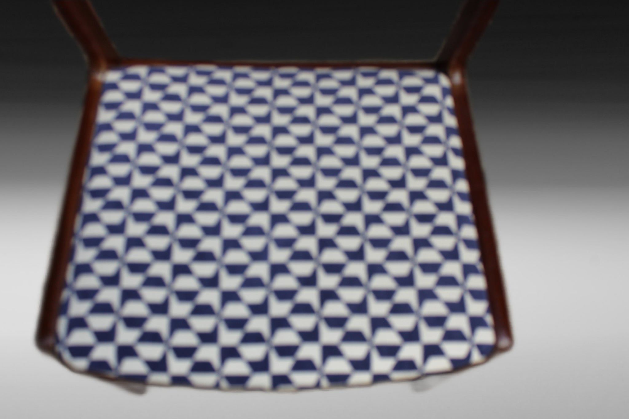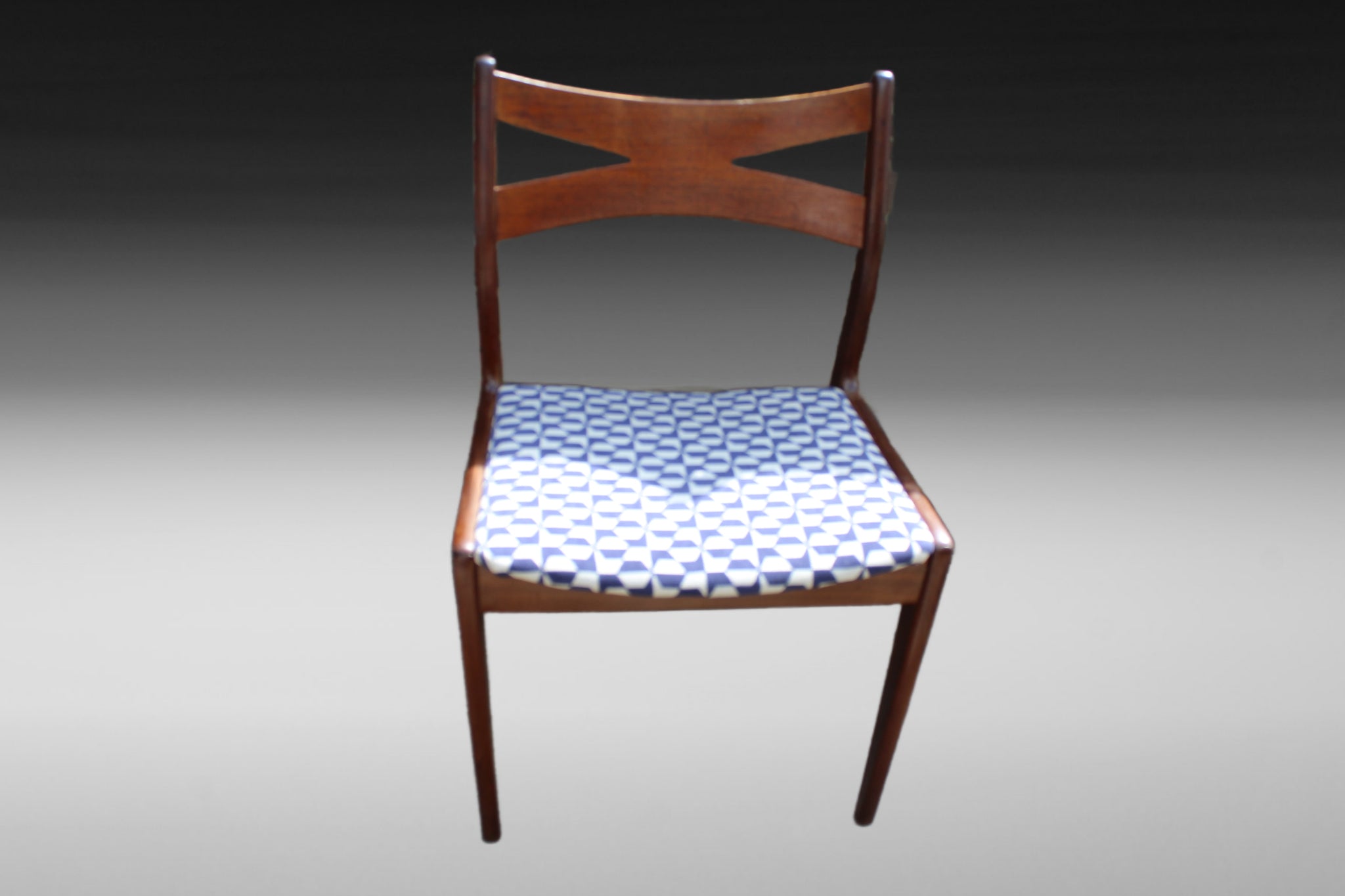 - Refurbished & reupholstered – featuring a navy and white geometric print.