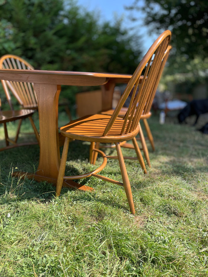 The Model 909 Latimer chairs are a rare find. This style chair is not your standard Quaker or Windsor chair, these are generously proportioned chair distinguished by their steam-bent under stretcher and timeless Windsor-inspired form. Paired with the matching ash table, this set embodies the craftsmanship and enduring style that have made Ercol a design icon for over a century.