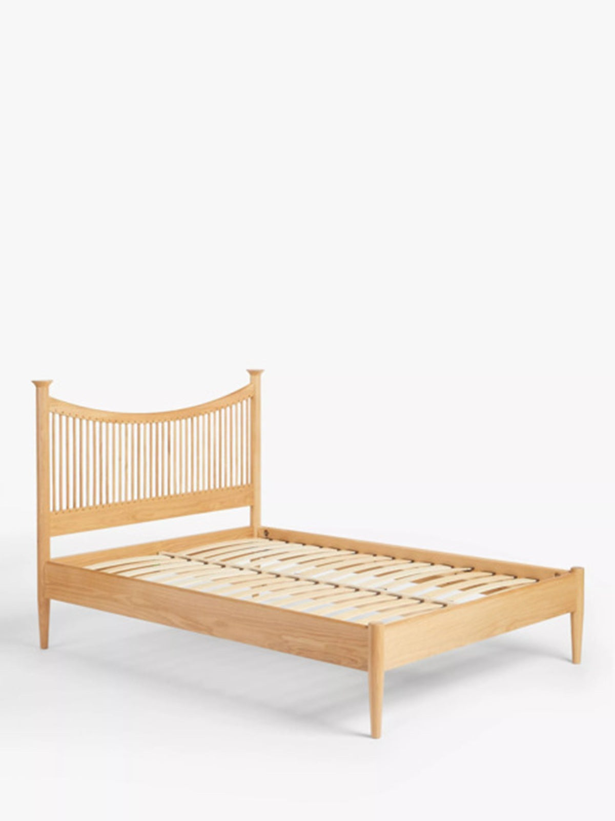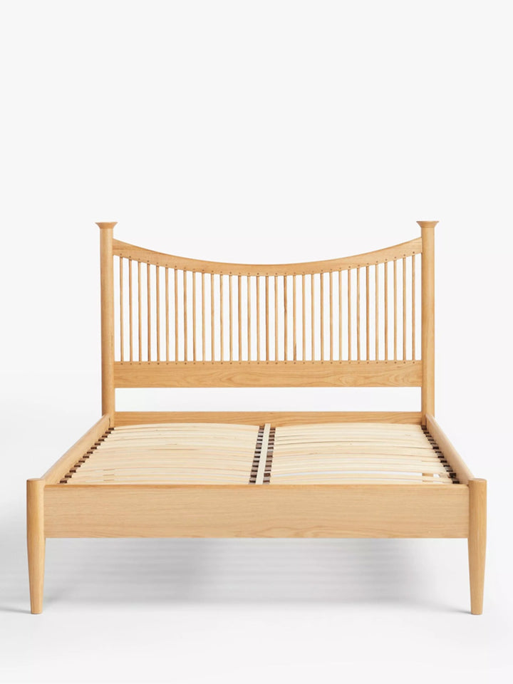 A beautifully designed John Lewis Essence double bed frame in oak, showcasing a clean mid-century modern aesthetic with subtle Scandinavian influence. The gently curved slatted headboard creates an elegant focal point, while the tapered legs and minimalist proportions give the piece a light, refined presence within a bedroom setting.